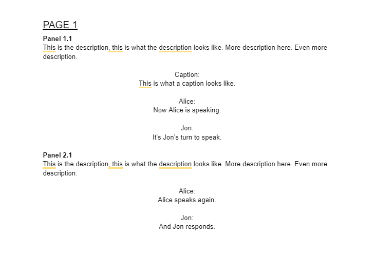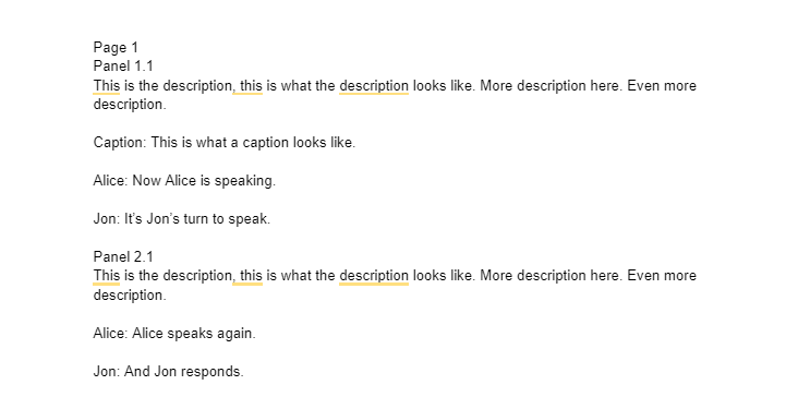 I personally prefer either Google Docs or Word Docs. These document types make it easy for your letterer to copy/paste your dialogue and captions directly into their lettering document, which can avoid a ton of errors. Most letterers don’t like PDFs, because they formatting and are not easy to copy/paste from, so I would avoid using them with letterers. Even if the letter can copy/paste from the PDF, I’ve found it adds paragraph and line breaks that I have to account for and fix, which adds extra time to the lettering process.